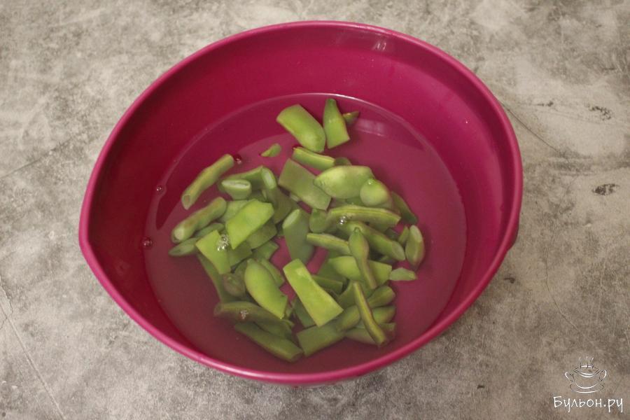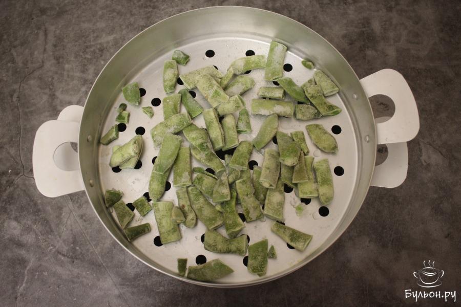 1. Перекиньте замороженную стручковую фасоль на отсек с отверстиями и готовьте фасоль на пару в течение 4-5 минут до полуготовности.