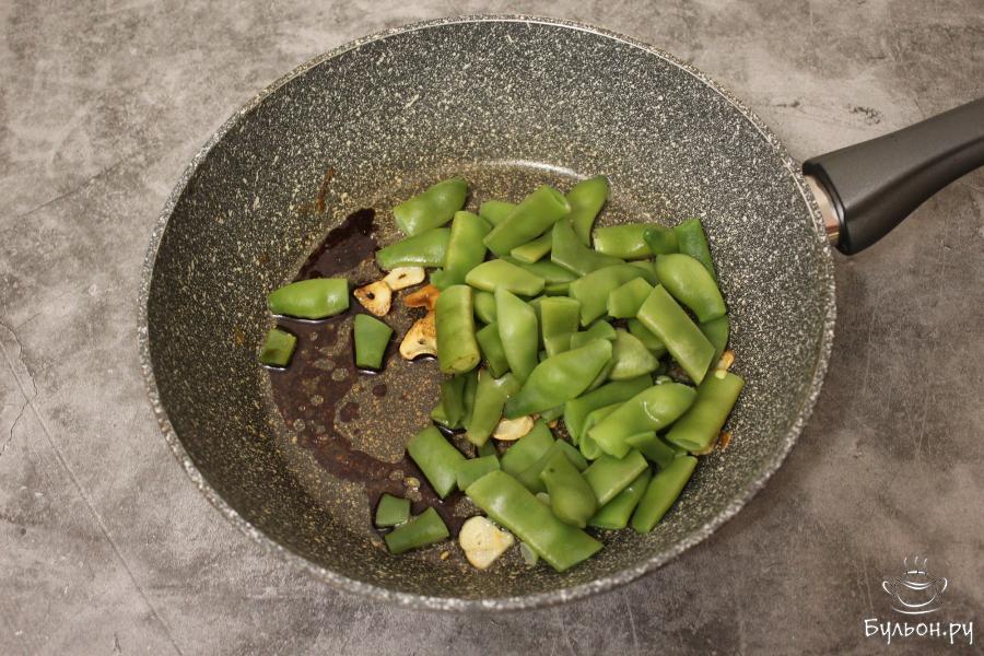 4. Выложите в сковороду к чесночному маслу фасоль, влейте соевый соус и обжарьте стручки фасоли на сильном огне.