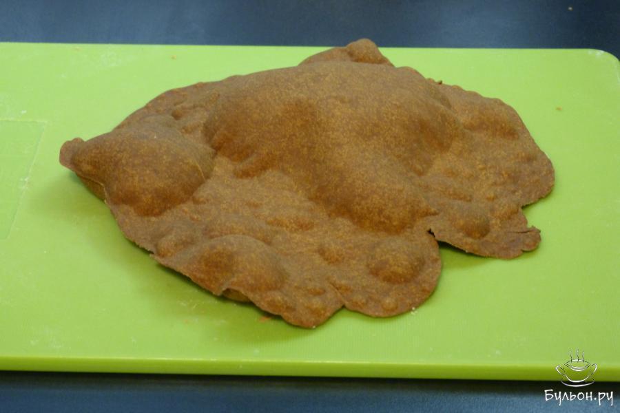 14. Из обрезков теста раскатать в произвольной форме последний корж, запечь его до темно-коричневого цвета.