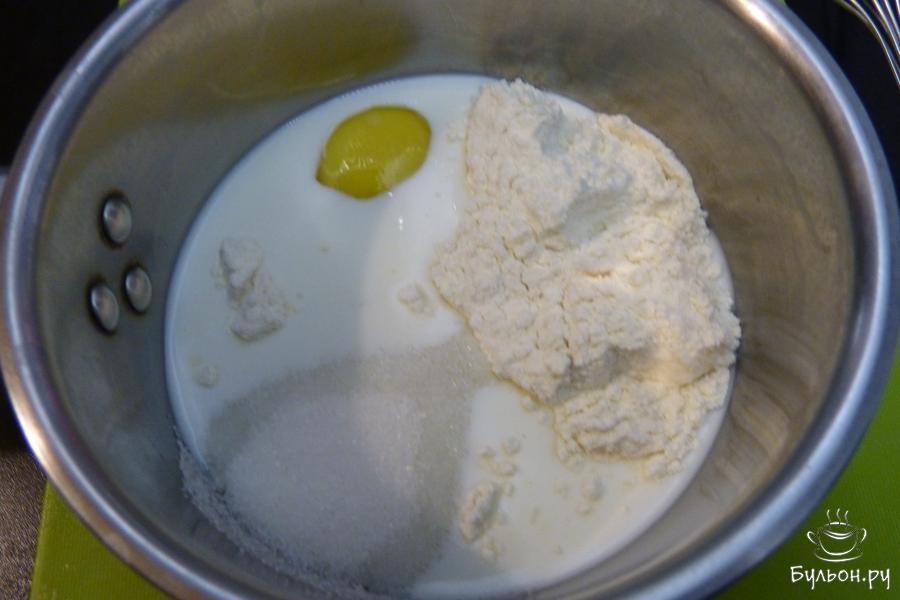 5. Пока наши шарики охлаждаются, надо приготовить крем. В чистую миску налить половину молока, добавить сахар, яйцо,3 столовые ложки муки с небольшой горкой и хорошо перемешать.