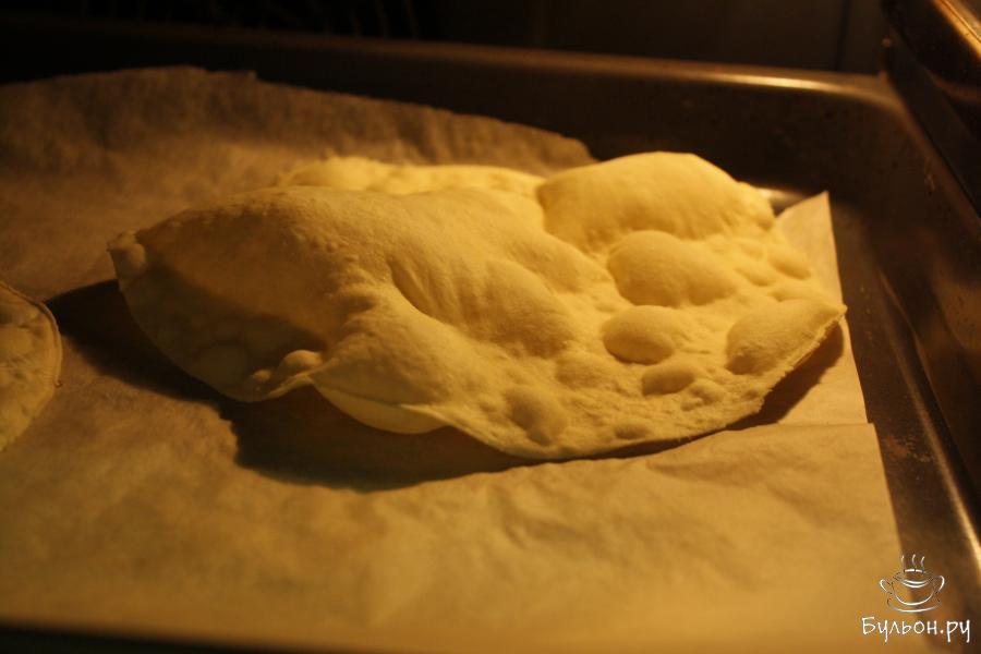 11. На противень переложить по 1 или 2 лепешки (сколько поместится, и поставить в духовку, разогретую до 180 градусов. Через минуту после того, как корж окажется в духовке, на нем появятся пузыри.