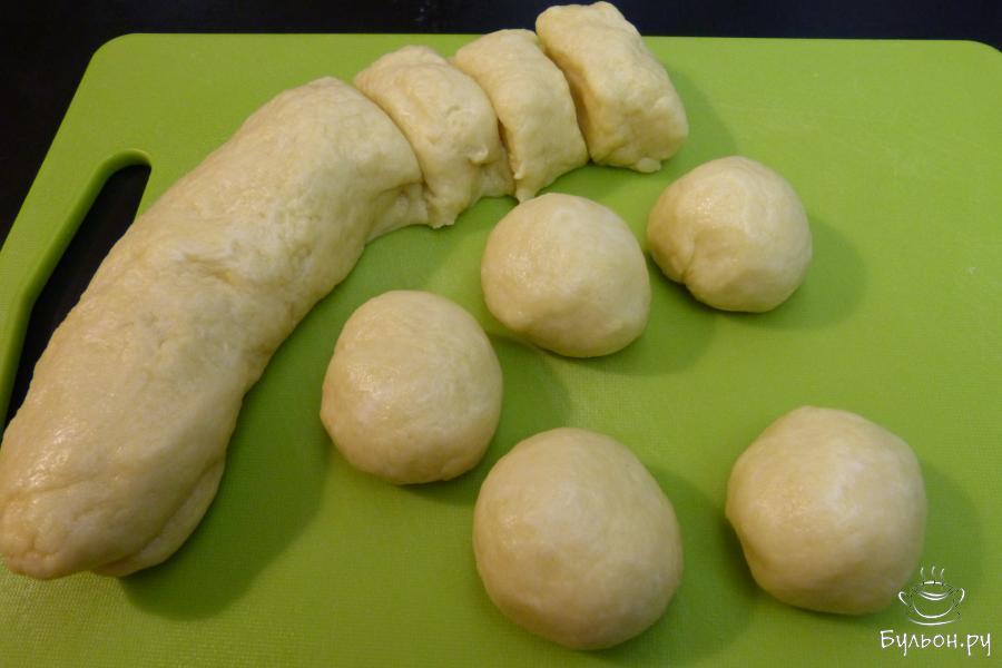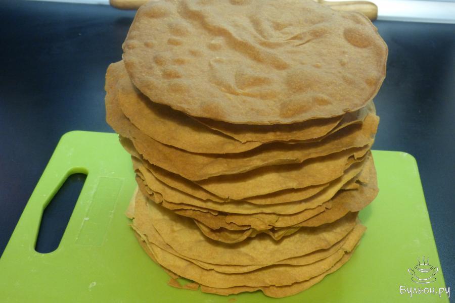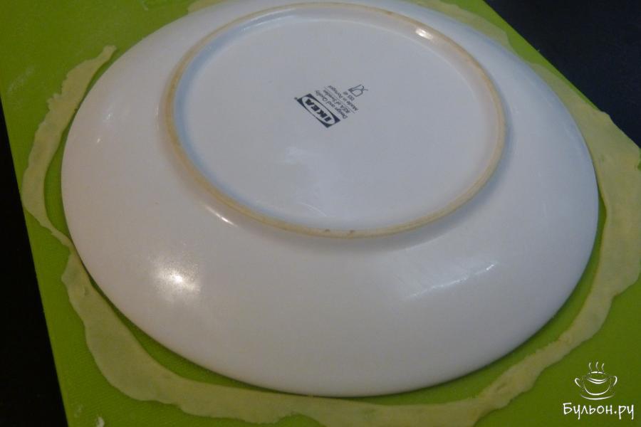 10. Достать из холодильника остывшие шарики, каждый поочередно раскатать в очень тонкую лепешку, пересыпая мукой. Вырезать круг нужного диаметра, обрезки теста убрать в мешочек, чтобы не заветрились.