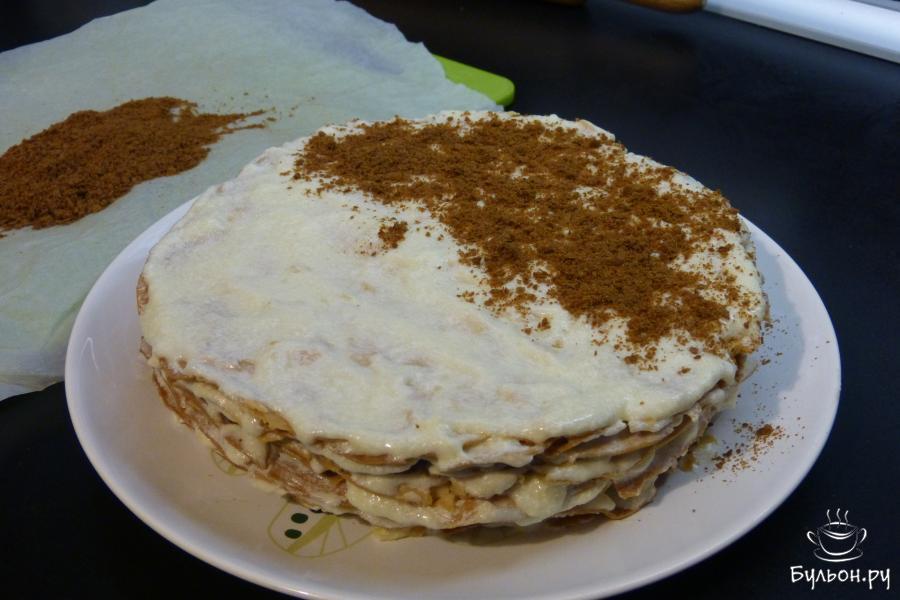 17. На последний корж положить обе свои ладони и акккуратно нажать на стопку так, чтобы коржи уменьшились по высоте вдвое. И только потом смазать верх кремом и посыпать крошкой.