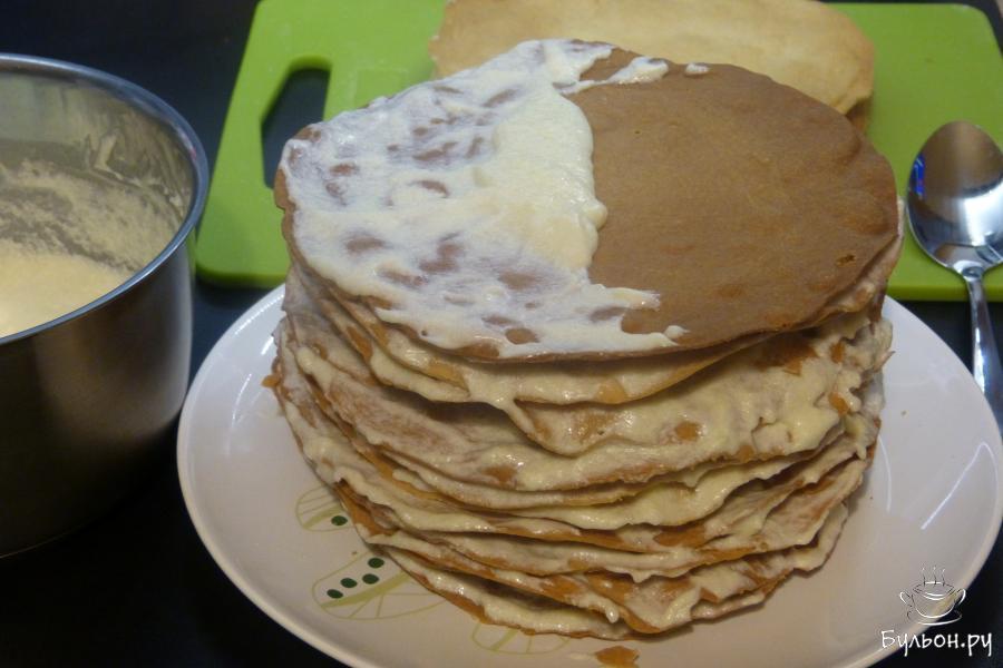 16. Теперь собрать торт. Взять большое блюдо, положить корж, смазать кремом, еще корж, и снова крем и так уложить все коржи, последний корж оставить не смазанным. Примерный расчет крема: 1 столовая ложка с бугорком на 1 корж.