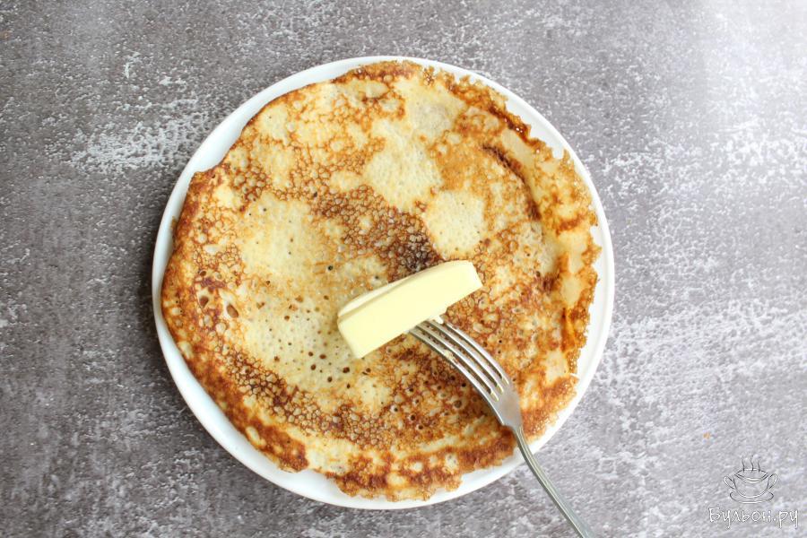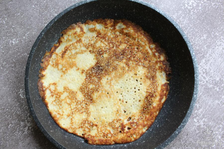 5. Сковороду разогреть. Вылить на сковороду теста, примерно около половины половника. Распределить тесто равномерно по сковороде. Жарить блины с каждой стороны до румяности.