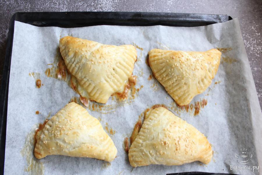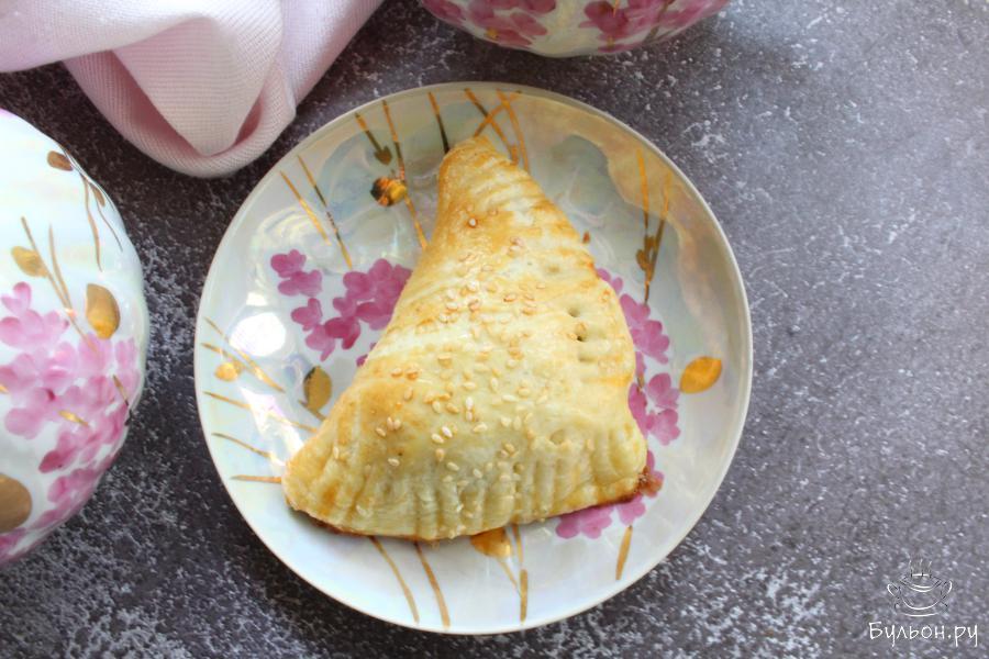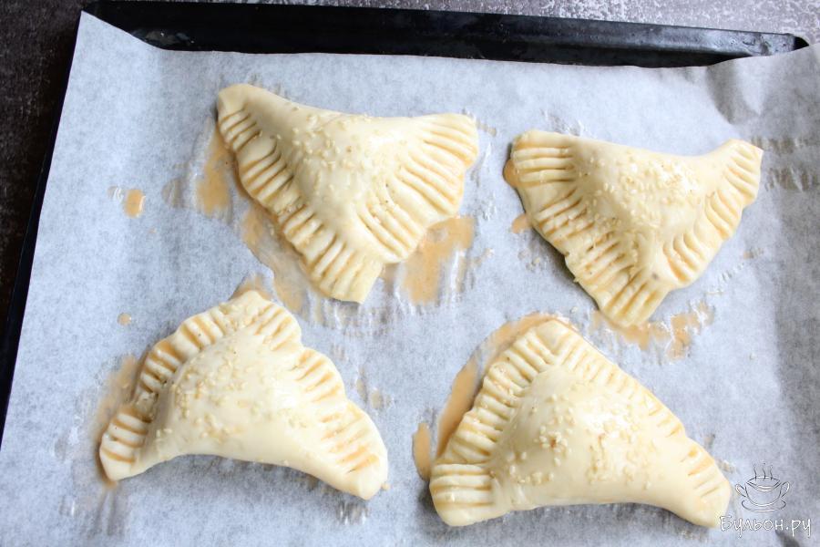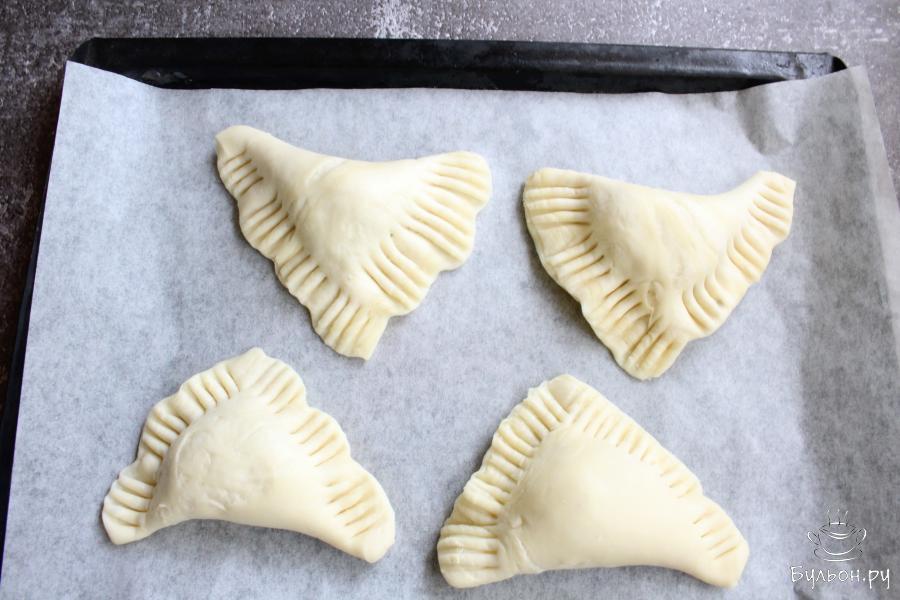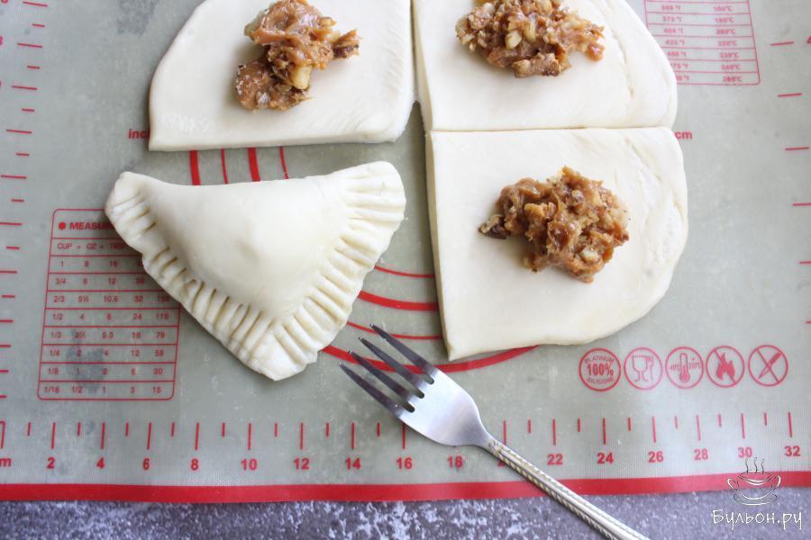 6. Сложить тесто так, чтобы получился треугольник. Края треугольника защипнуть и придавить края слойки вилкой.