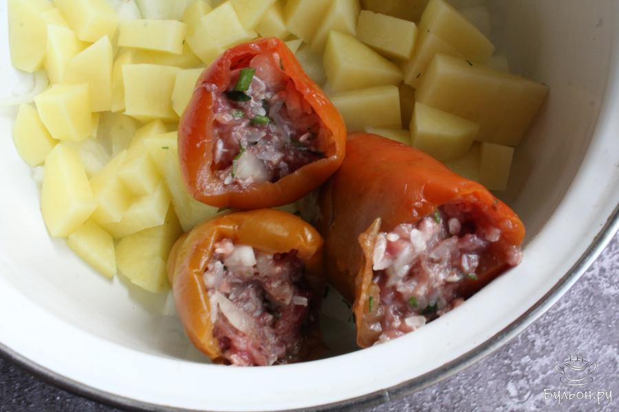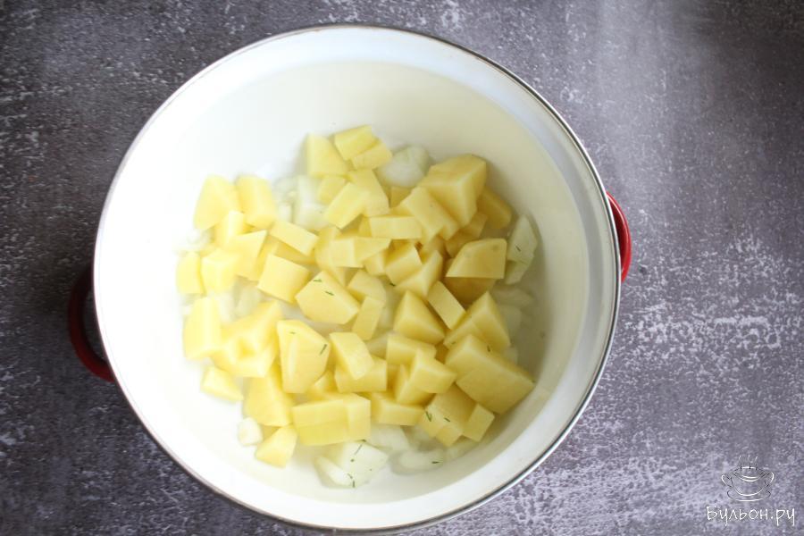 5. Картошку и оставшуюся луковицу нарезать небольшими кубиками. На дно кастрюли выложить овощи. Добавить растительное масло, соль по вкусу.