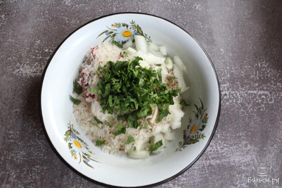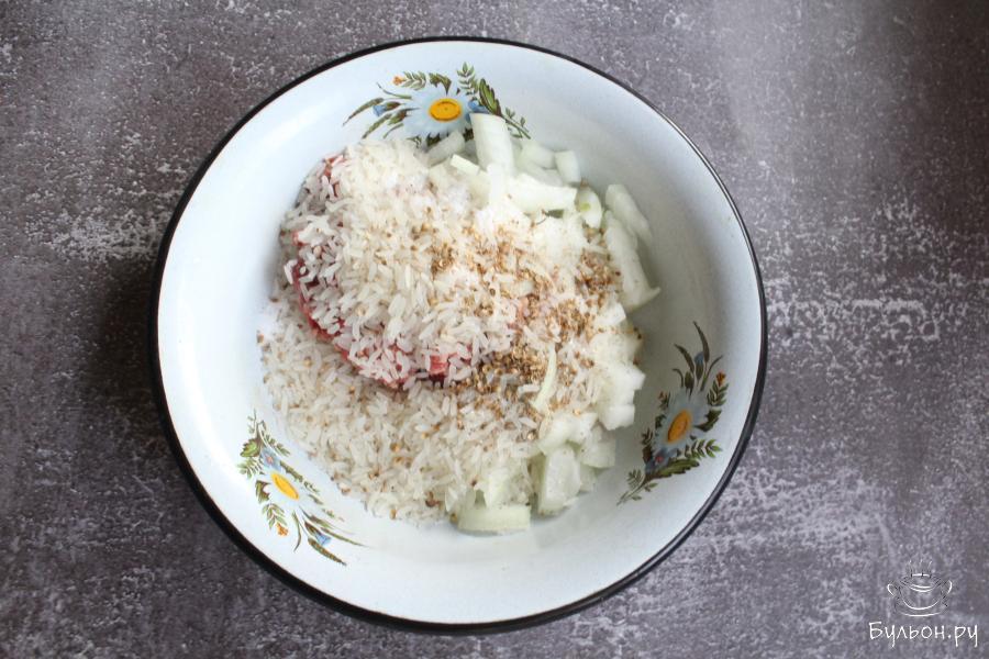 1. Фарш выложить в чашку. Лук и картошку почистить, промыть. Одну луковицу нарезать мелко и добавить в фарш.