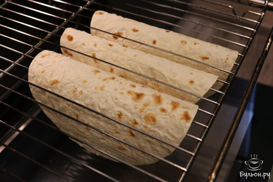 5. Лепешки тортильи подсушите в духовке в течение 5 минут, придав им необходимую форму. Сделайте это с помощью решетки.