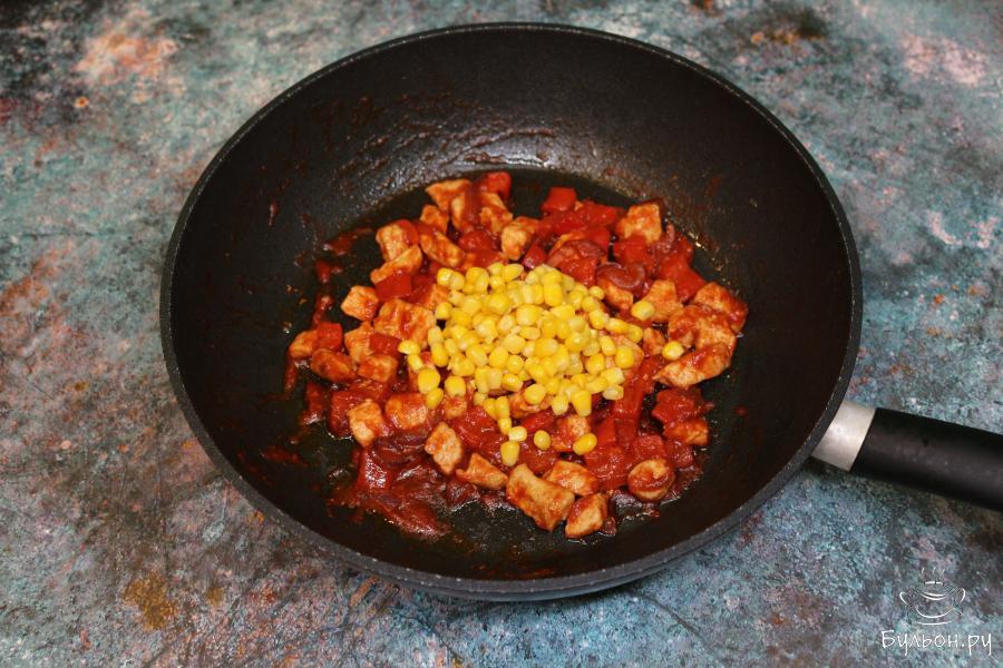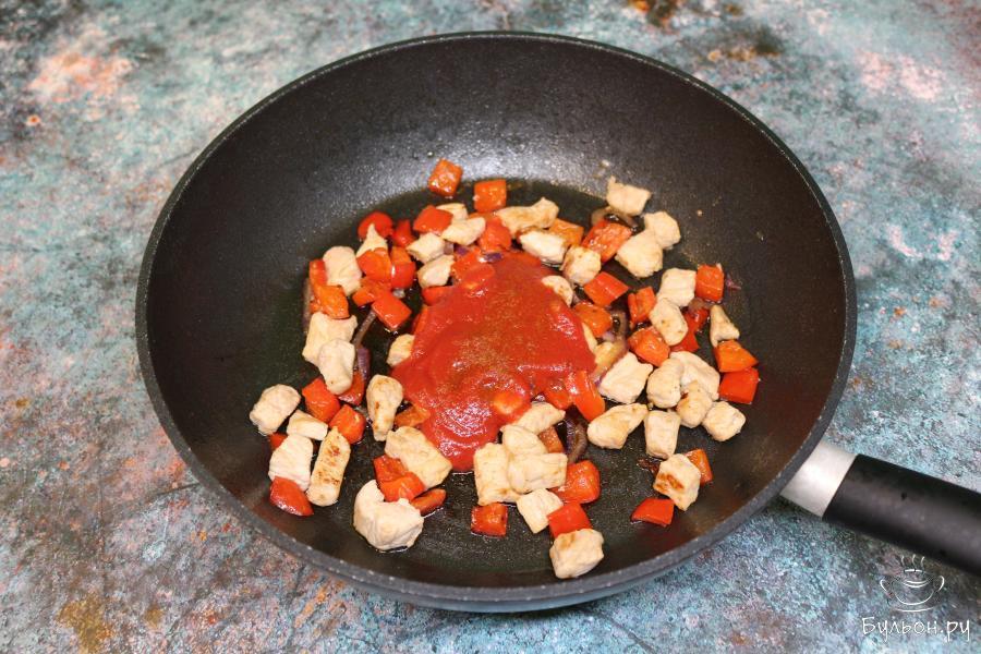 3. Далее добавьте протертые томаты в собственном соку, красный перец чили и соль. Тушите еще 3 минуты.