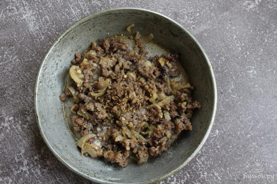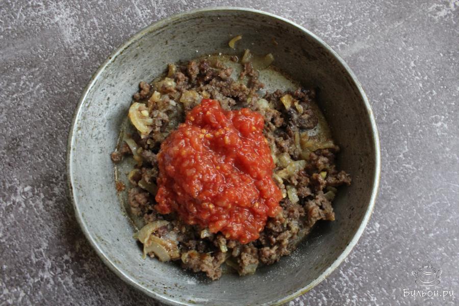 3. Добавить перетертый помидор и обжарить все вместе еще несколько минут. Начинку перемешать, добавить 0.5 ч. л. соли, еще раз перемешать. Соль лучше добавлять по вкусу.
