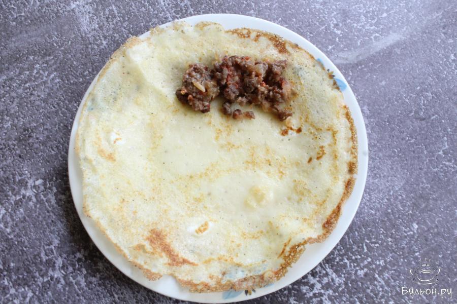 9. На краешек блинов выкладывать по 2-3 ч. л. начинки. Сворачивать блинчик бочонком, подгибая края внутрь.