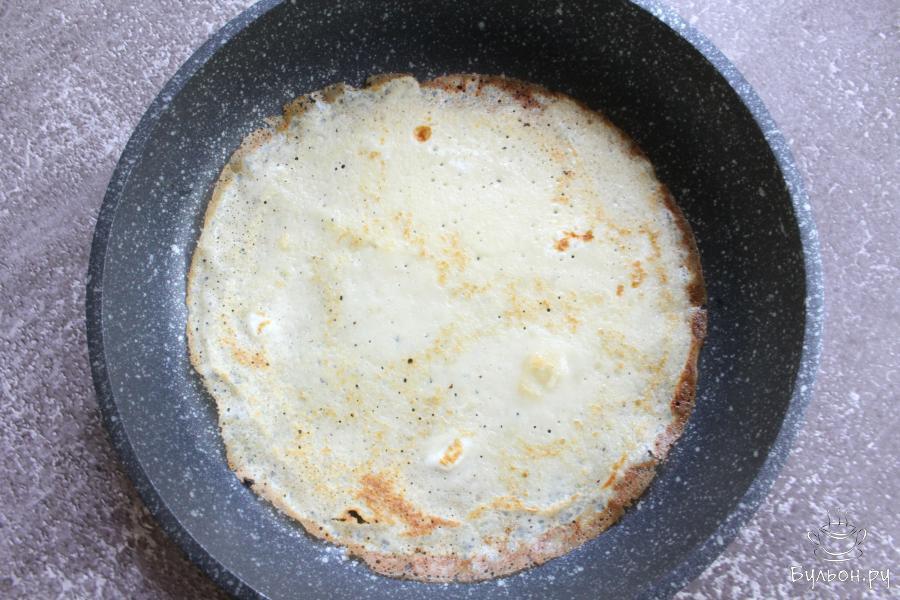 8. Сковороду хорошо разогреть. Выливать менее половины половника теста на сковороду и распределять его равномерно по сковороде. Жарить блины с двух сторон до румяного цвета.