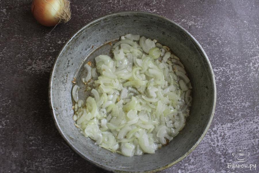 1. Для начинки, на сковороде разогреть 20 мл. растительного масла. Лук почистить, промыть, мелко нарезать и обжарить до мягкости.