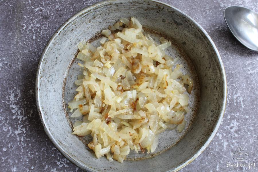 2. Лук почистить, промыть, нарезать мелко. На сковороде разогреть масло и обжарить лук до румяного цвета.