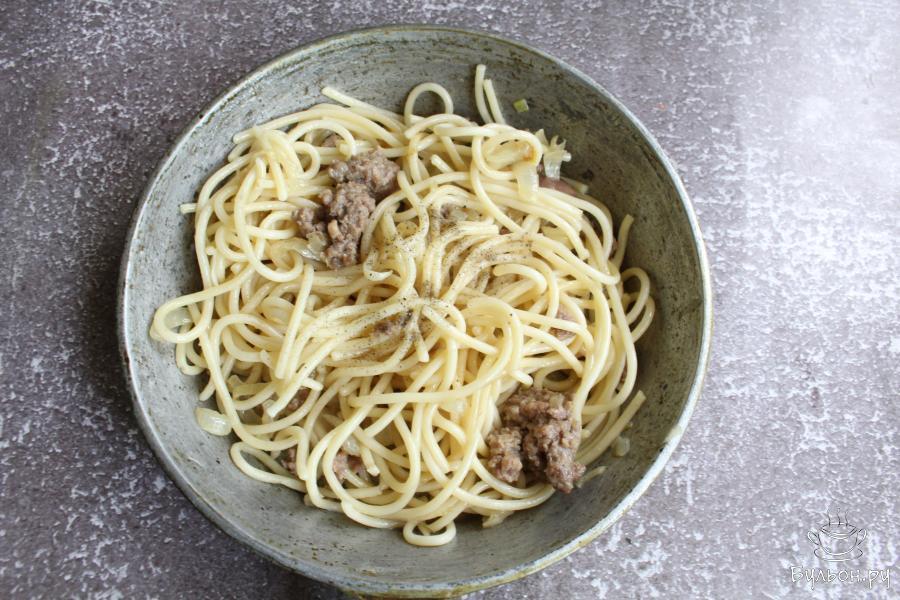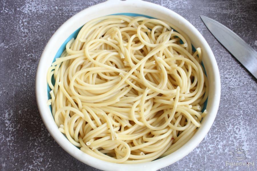 1. Спагетти сварить в кипящей воде до готовности и откинуть на дуршлаг. Ориентируйтесь по инструкции на пачке, там указано сколько по времени варить данные спагетти.
