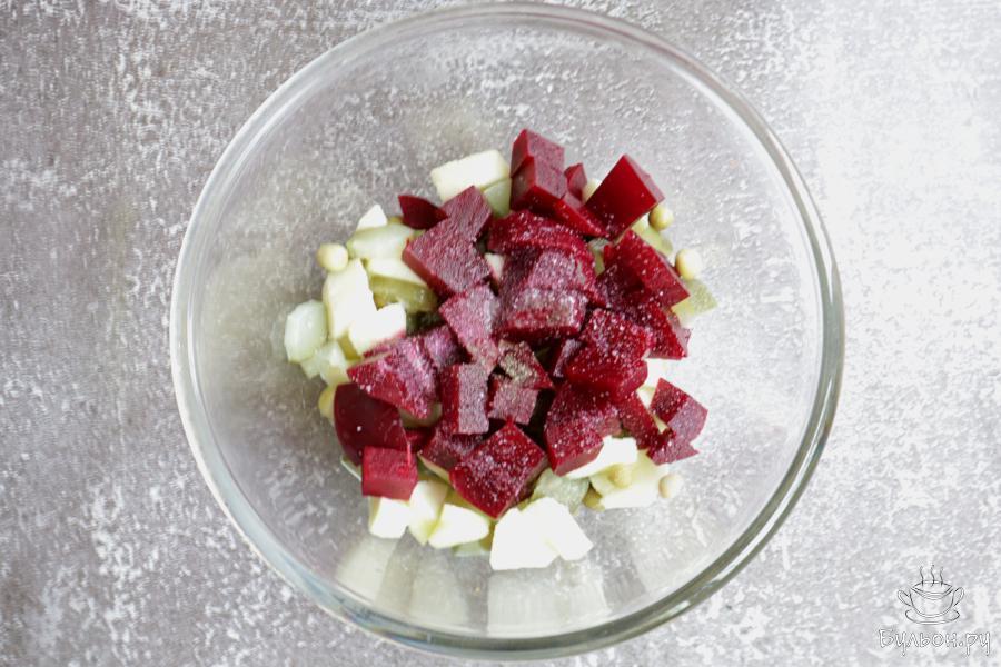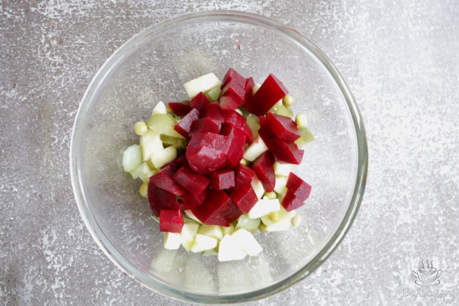 Если хочется отдохнуть от калорийных салатов, то на помощь приходят постные и вегетарианские рецепты. Салат из вареной свеклы с яблоком и зеленым горошком - это легкий, яркий и полезный салат. Готовится салат из доступных продуктов и он порадует вас своим вкусом. Салат можно заправить любым, любимым растительным маслом и по желанию, можно добавить в салат лимонный сок. Яблоки для приготовления салата берите с кислинкой, хрустящие и сочные.