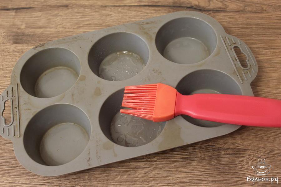 1. В первую очередь с помощью кондитерской кисточки смажьте дно и боковые стороны силиконовых формочек растительным маслом.