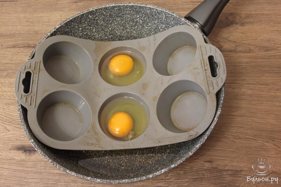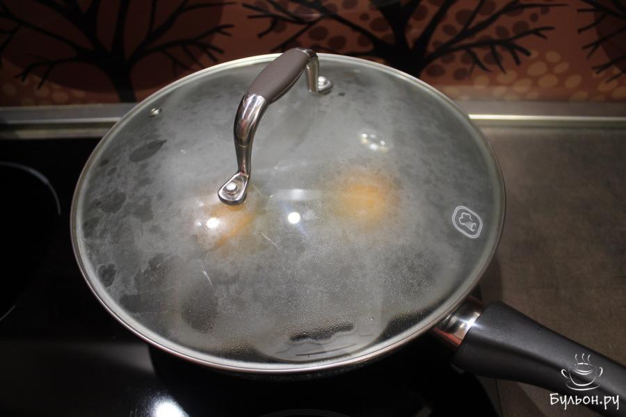 4. Сковороду поставьте на средней огонь и закройте стеклянной крышкой. Как только яйца начнут белеть, засеките 1-2 минуты. Все зависит от категории яиц и самих форм.