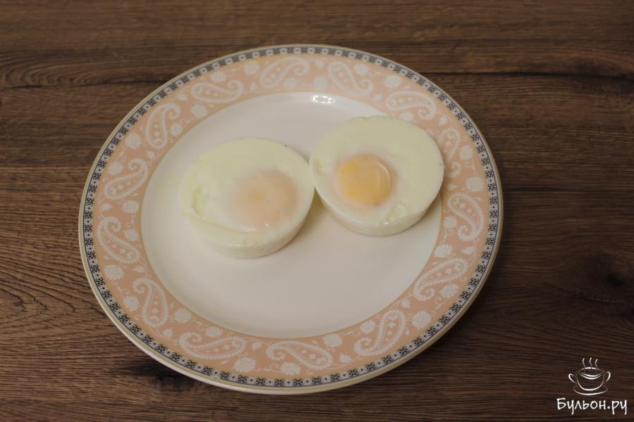 5. После чего снимите сковороду с огня, достаньте силиконовые формы, аккуратно оттените боковые стороны формочек. При необходимости можно помочь ножом. Затем, быстрым движением переверните форму и яйца сами выпадут. Приятного аппетита!