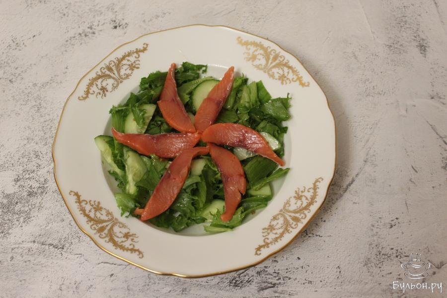 5. Слабосоленую рыбу нарежьте небольшими кусочками и выложите поверх пропитанных заправкой овощей. Салат сразу подавайте на стол.
