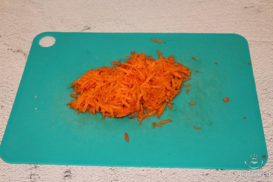 3. Морковь натрите на крупной терке. Добавьте в сковороду, не перемешивайте. Влейте горячую воду так, чтобы она полностью покрывала все. Накройте сковороду крышкой, тушите еще минут 7. Обратите внимание, что воды может потребоваться иное количество, это зависит от диаметра вока.