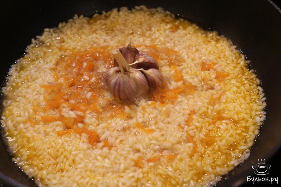 5. Чеснок промойте, удалите верхний слой шелухи и выложите глубоко в рис. Закройте крышку сковороду и готовьте. Готовьте плов еще 20 минут. Затем выключите огонь и дайте настояться плову еще столько же времени.
