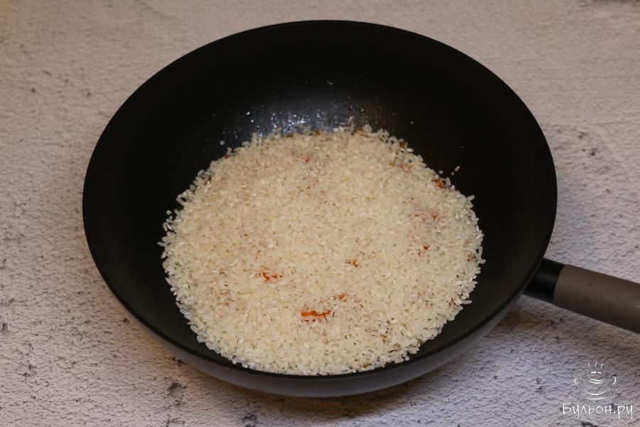 4. После добавьте перец и соль. Рис выложите ровным слоем поверх моркови. Аккуратно по стенке сковороду влейте горячую воду. Она должна быть по уровню воды выше на пару сантиметров. Деревянной ложкой проткните в нескольких местах, чтобы вода равномерно дошла до дна.