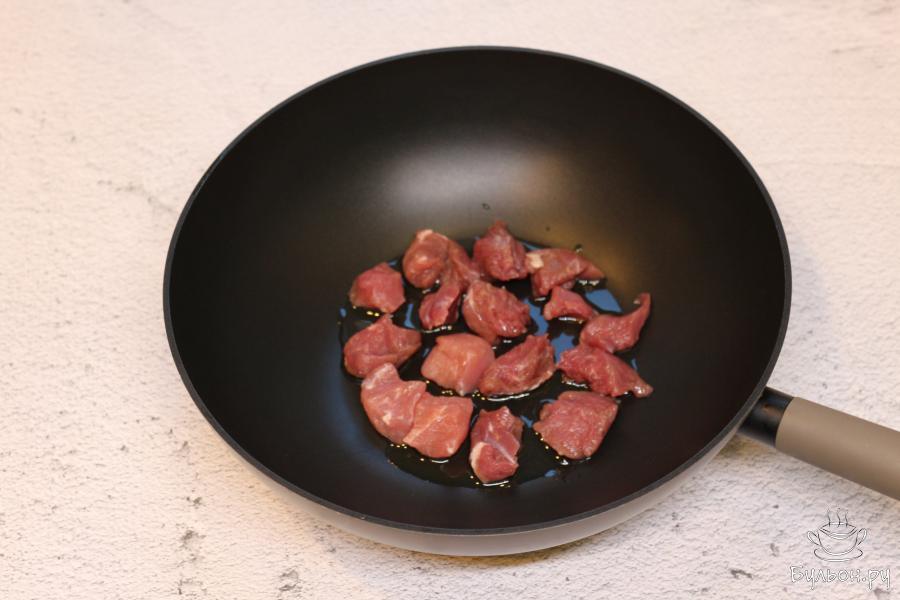 1. Баранину нарежьте на кусочки. В сковороду вок или казан налейте растительное масло. Разогрейте масло, после добавьте кусочки мяса. Обжаривайте их 10-15 минут.