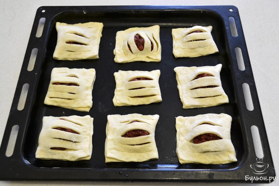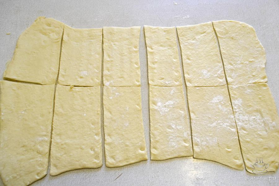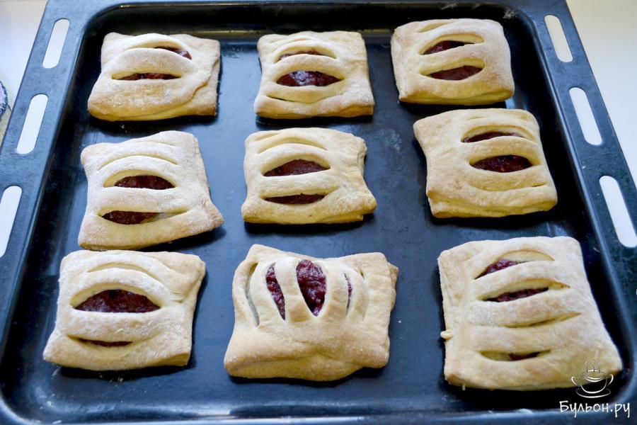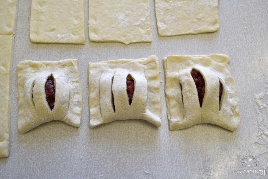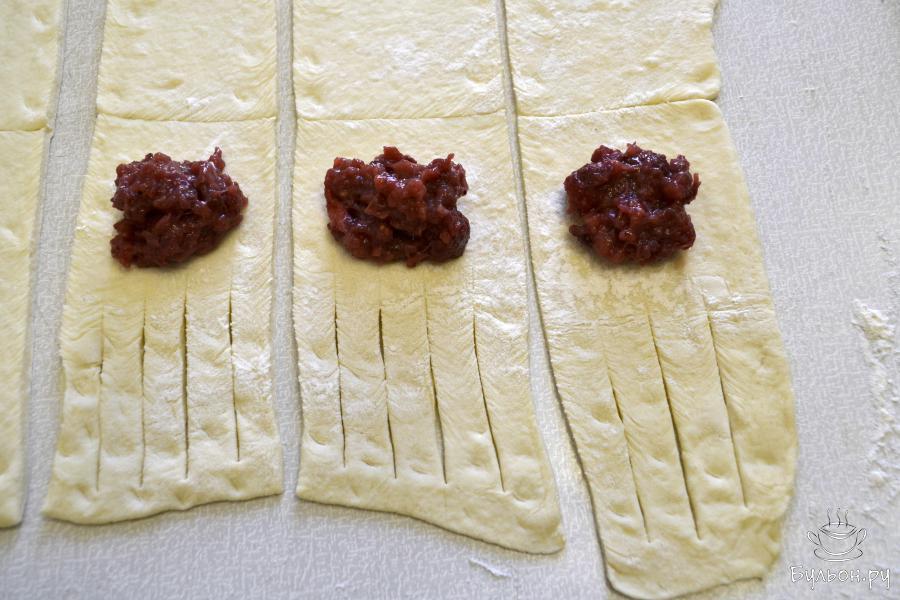 3. На край каждого прямоугольника положите густое варенье, джем (повидло). На противоположной стороне прямоугольника сделайте надрезы, как на фото.