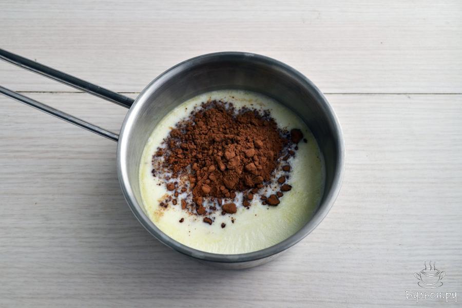 2. Всыпьте в горячее молоко какао-порошок и венчиком сразу же перемешайте, чтобы не осталось комочков. Доведите до кипения.