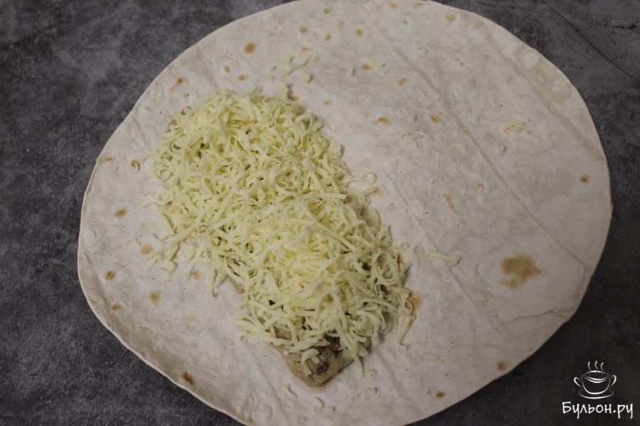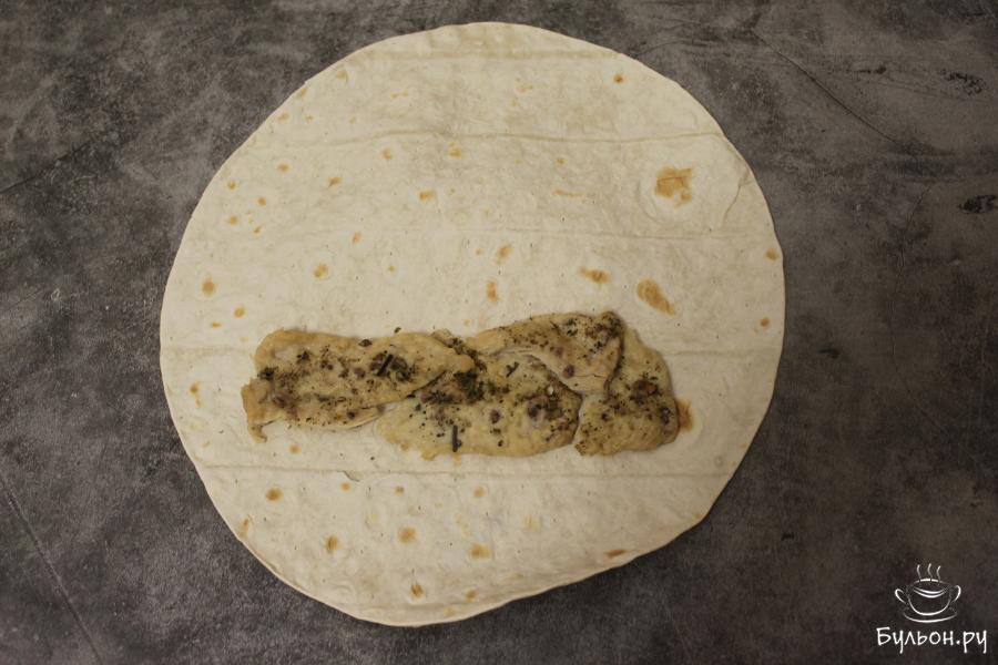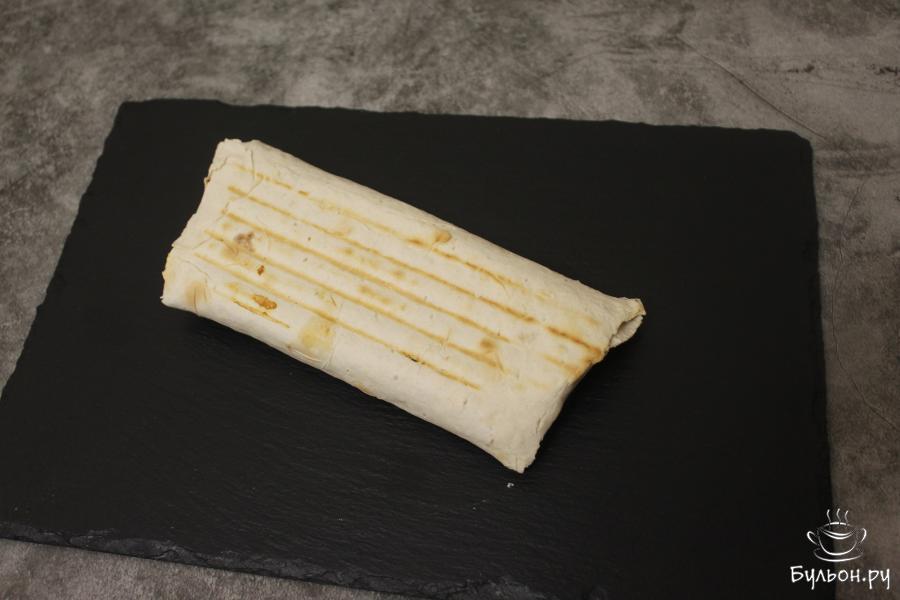 5. Заверните начинку в лепешку, должен получиться ролл. Запеките ролл в гриле и сразу же в горячем виде подайте на стол, желательно со свежими овощами.