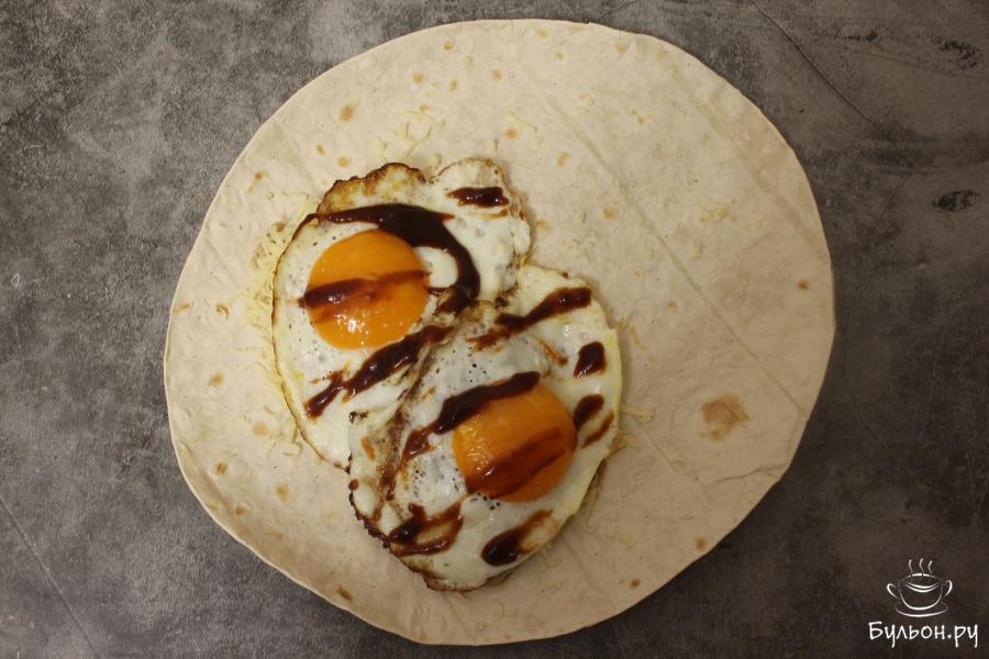 4. Приготовьте глазунью из 2 яиц на сливочном масле, положите поверх натертого сыра, приправьте соусом барбекю.