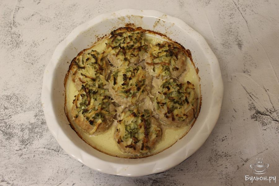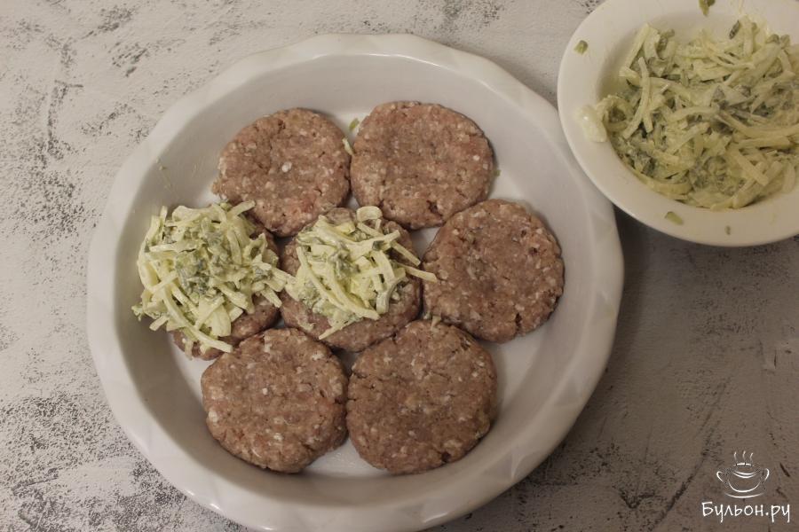 4. Форму для запекания смажьте растительным маслом. В форму выложите слепленные из фарша и немного приплюснутые котлеты. Поверх котлет выложите шубку.