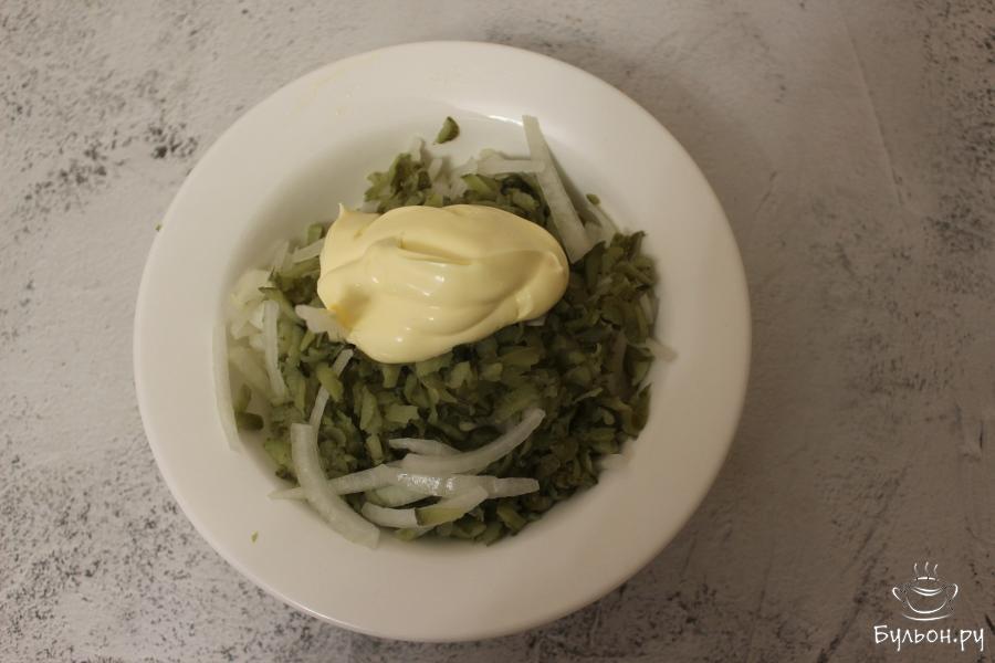 3. Приготовьте шубку. Оставшийся лук нарежьте перьями, маринованные огурцы натрите на крупной терке, добавьте майонез и все тщательно перемешайте.