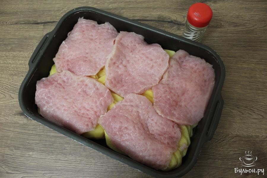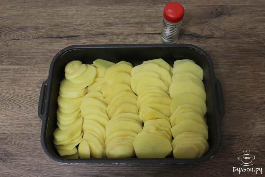 1. Латку слегка смажьте растительным маслом, выложите в нее аккуратно нарезанный кружочками картофель, присолите.