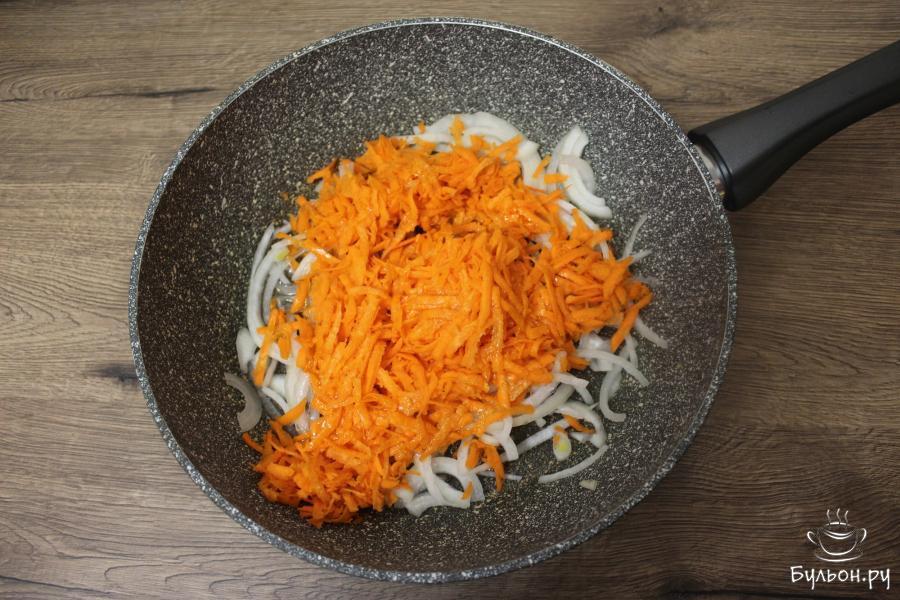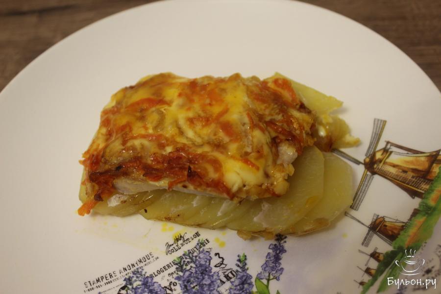 5. Запекайте свинину с картошкой под луково-морковной шубкой в духовке, разогретой до 180 градусов, примерно 50 минут.