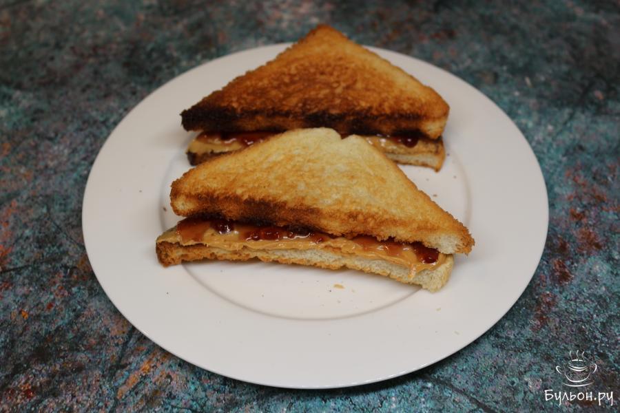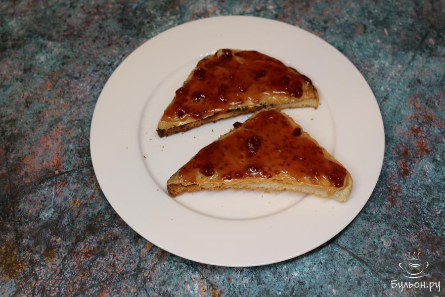 Сэндвичи с арахисовой пастой и джемом пользуются огромной популярностью в США и Канаде. Их часто готовят на завтрак, перекус, дают детям с собой в школу, берут их с собой на работу. Такие тосты устраняют надолго чувство голода, так как арахисовая паста очень каллорийная. Само сочетание вкуса арахиса и сладкого варенья или джема, довольно необычное, но очень интересное, мне понравилось. Варенье и джем можно выбирать на свой вкус. Это может быть вкус, например, клубничный. В оригинальном рецепте используется виноградный джем. Я приготовила сэндвичи с малиновым вареньем.