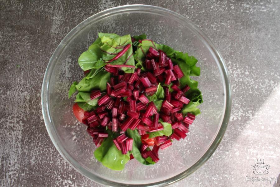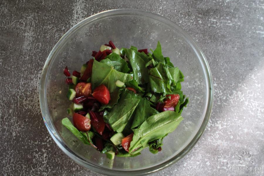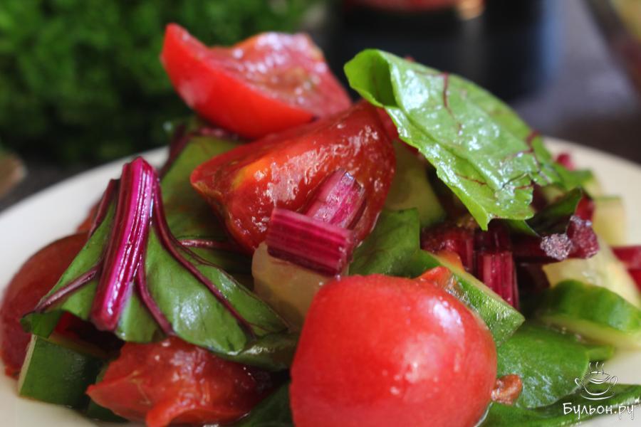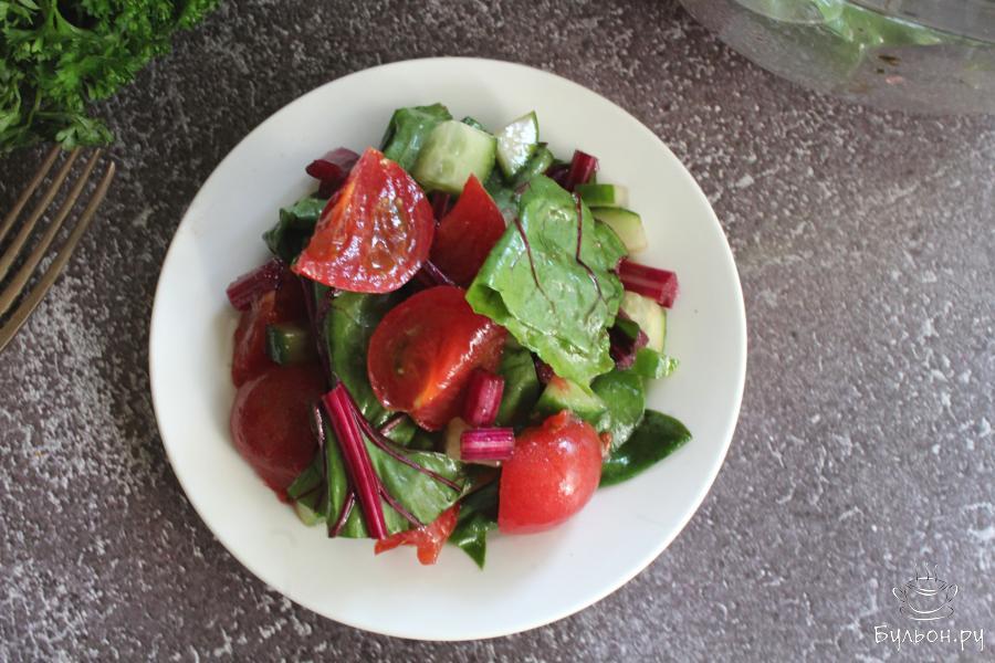 Салат из помидоров, свежих огурцов и свекольной ботвы готовится за считанные минуты. Такой весенний салат получается очень вкусный, хрустящий, сочный, яркий, полезный и витаминный. Салат всегда можно дополнить своей любимой зеленью, зелени много не бывает. Заправить этот легкий салат можно любым, душистым растительным маслом, которое вы любите. Данный овощной салат подходит для постящихся и вегетарианцев.