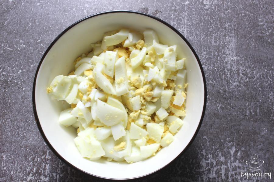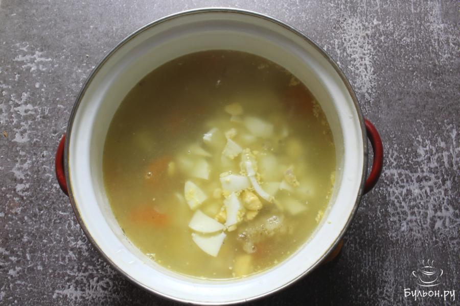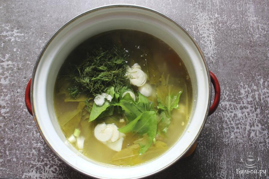 9. Укроп нарезать мелко, молодой чеснок крупно, выложить в кастрюлю. Перемешать и сразу убрать посуду с огня.