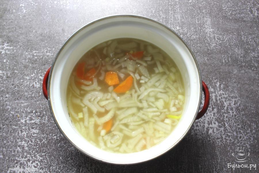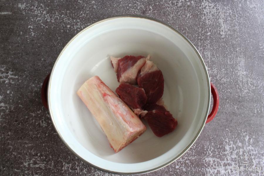 1. Говядину промыть, нарезать на не очень мелкие кусочки. По желанию, для более наваристого бульона можно взять мозговую косточку. Выложить мясо и косточку в кастрюлю, залить водой и варить 40 минут, снимать пену.
