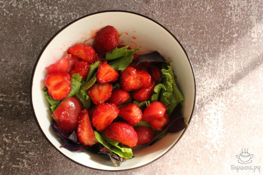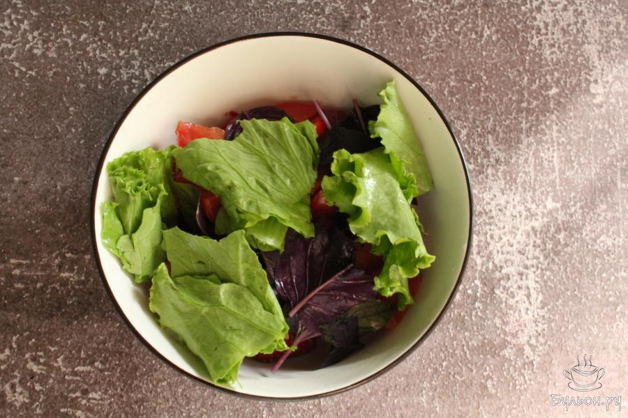 4. Базилик и листья салата промыть, обсушить. Листья салата порвать руками крупно. Листья базилика мелкие - добавить целиком, крупные - порвать руками.