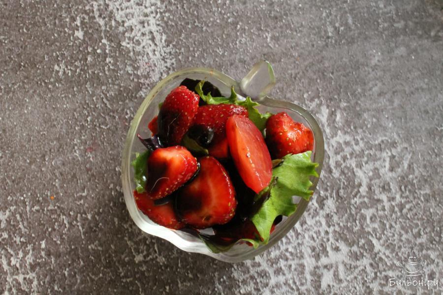 Для любителей необычных сочетаний вкусов, предлагаю приготовить салат из клубники и помидоров с бальзамическим соусом. Если вам попалась не очень сладкая, твердая клубника, то она как раз подойдет для такого салата. Помидоры же желательно выбирать сладкие, небольшого размера и мясистые. Салат порадует вас своим ярким цветом и необычным освежающим вкусом. Салат легкий, невероятно сочный, очень ароматный и вкусный. Это просто заряд витаминов и хорошего настроения!