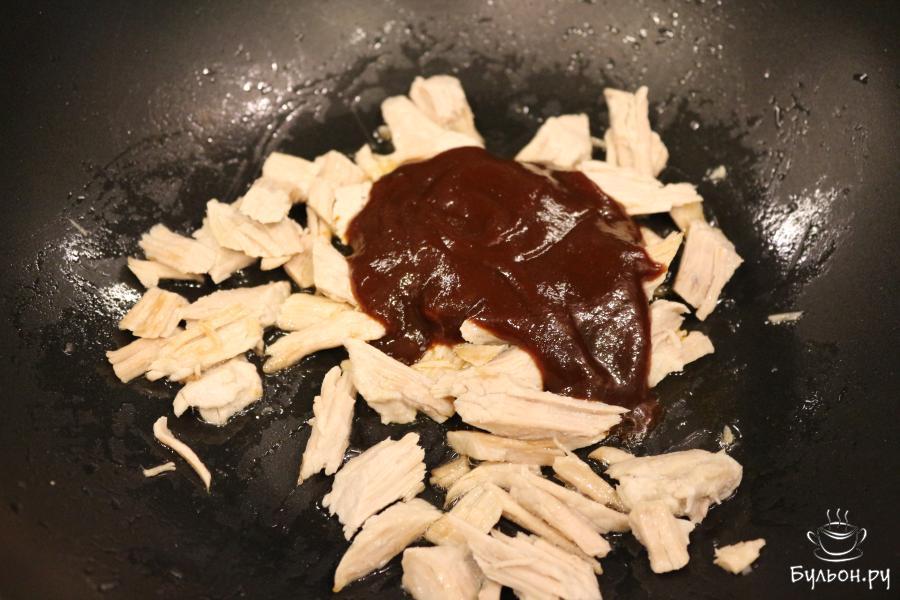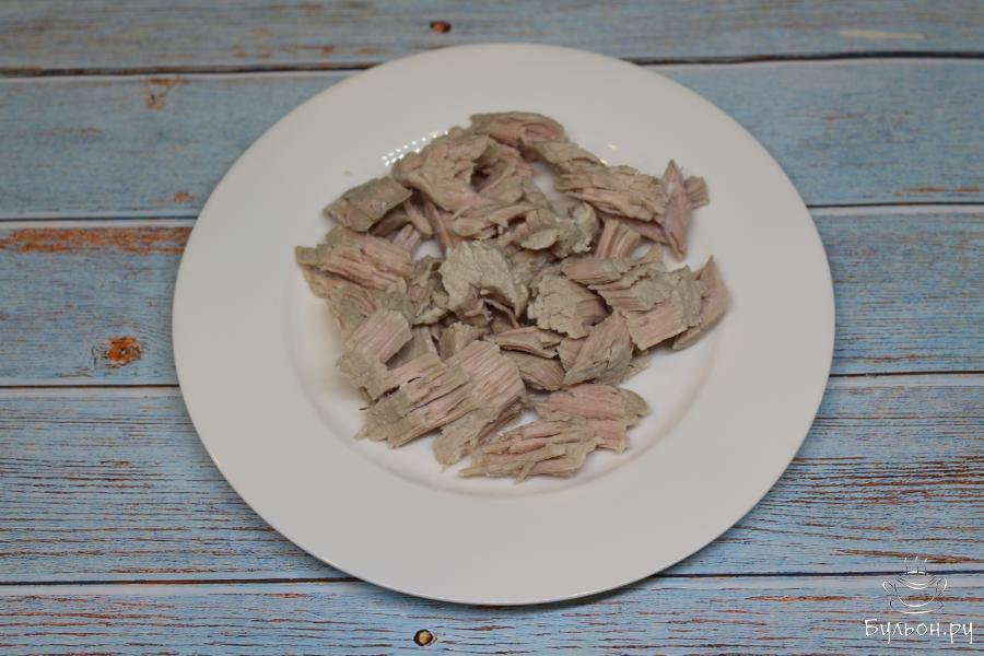 1. Отварите свинину, в течение часа, в чуть подсоленой воде. Затем свинину порвите руками на кусочки. Слегка обжарьте ее на растительном масле. В ингредиентах указано количество грамм уже вареного мяса.