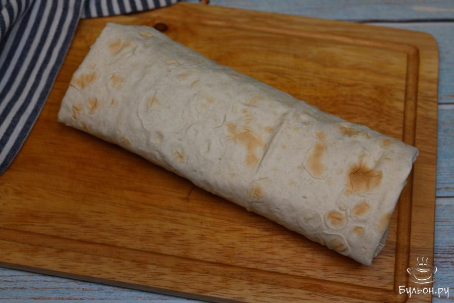 6. Сверните из лаваша ролл, вначале завернув нижний и верхний края, а затем от одной боковой стороны к другой.