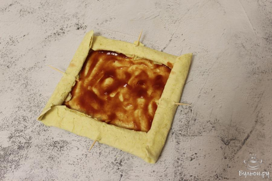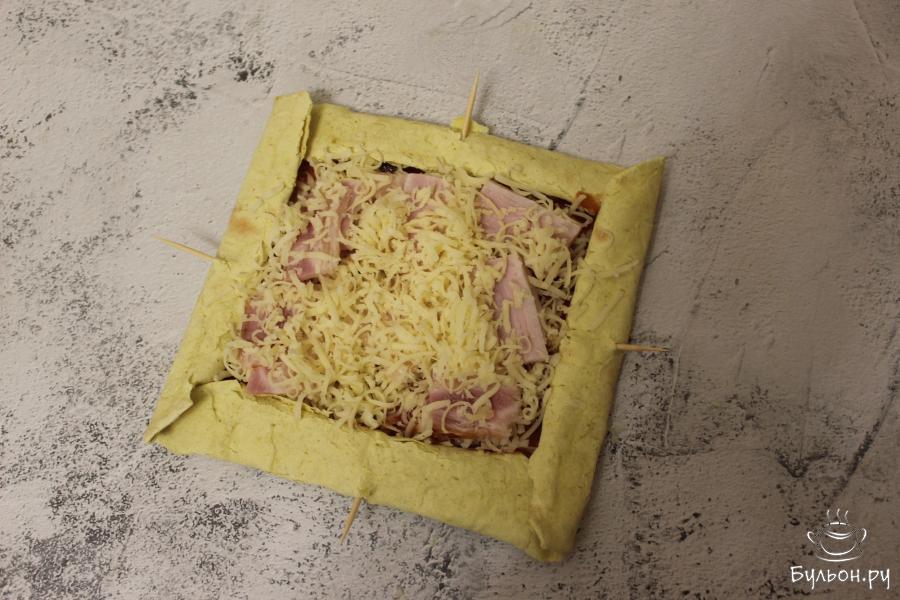 3. Поверх кетчупа посыпьте половиной натертого сыра, затем выложите ломтики грудинки и снова посыпьте оставшимся натертым сыром.