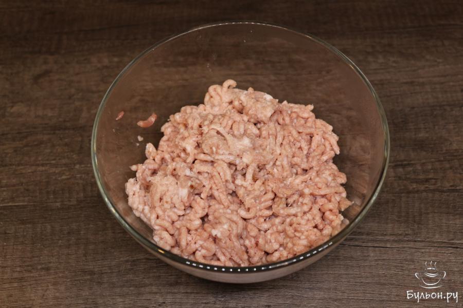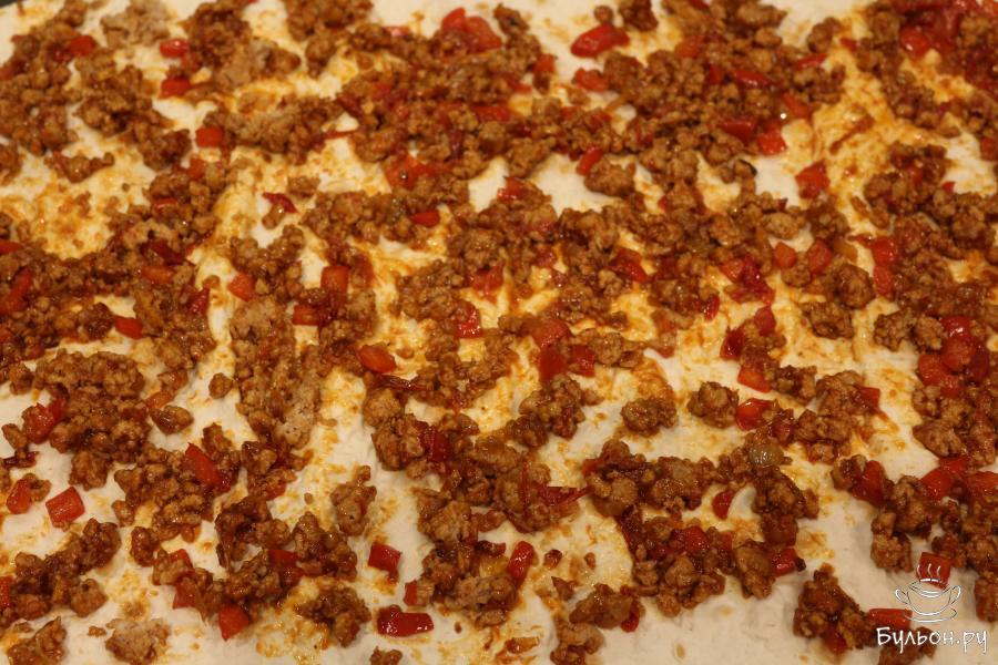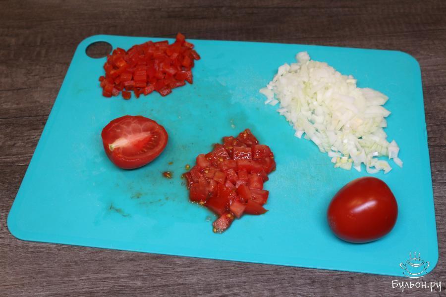 2. Лук нарежьте мелкими кубиками, помидоры и болгарский перец нарежьте тоже некрупными кубиками. В сковороду влейте масло, разогрейте и слегка обжарьте лук до прозрачности. Затем добавьте фарш и, постоянно помешивая, жарьте в течение нескольких минут.