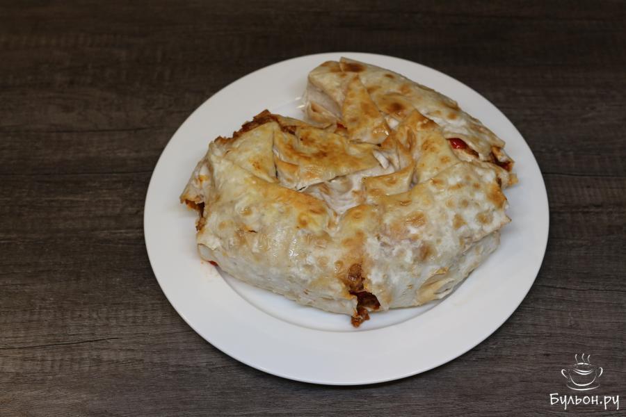 4. Лист лаваша быстро промажьте с помощью силиконовой кисти водой. Выложите начинку и разровняйте ее по всему листу. Второй лаваш также смочите водой и выложите сверху на начинку. Сверните рулет. Далее, рулет сверните в форму завитушки и выложите на чистую сковороду с одной ложкой масла.