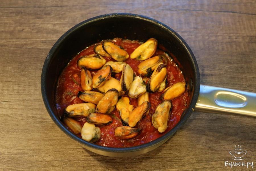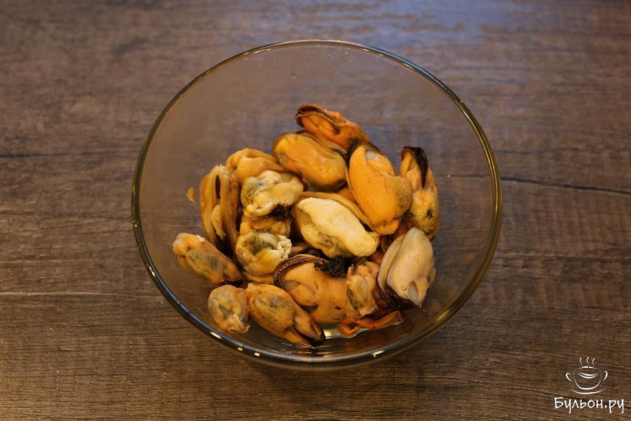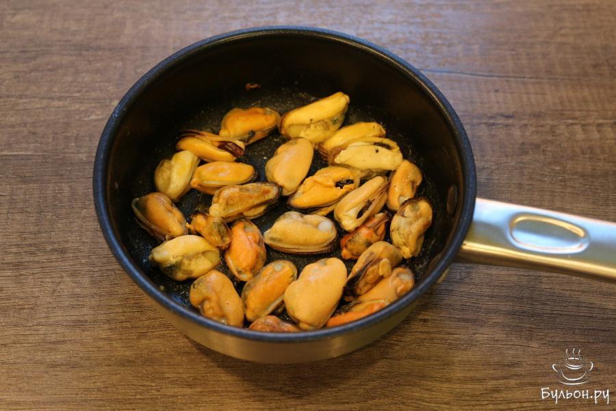 2. В сковороду влейте ложку масла, разогрейте, выложите мидии. Обжарьте их 2-3 минуты. Выложите их на блюдо.