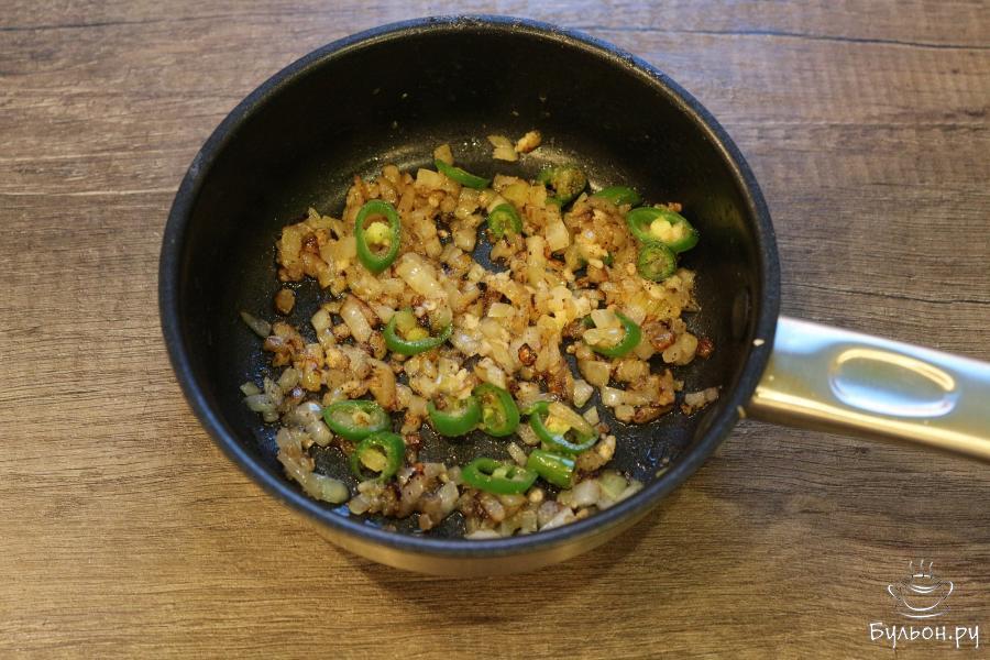 4. В сковороду влейте остатки масла, выложите в нее лук и обжарьте до мягкости. Затем добавьте перец чили, чеснок, сахарный песок, черный молотый перец и немного соли. Жарьте все вместе еще 2 минуты.